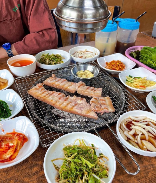 찜질 후 먹은 삼겹살과 목살, 된장찌개는 정말 꿀맛이었습니다. 고기를 숯불로 초벌해주니 한층 더 맛있었고, 3초삼겹과 된장찌개는 꼭 추천하고 싶습니다. 찜질 후 먹는 냉면은 별미였어요. 주말이라 사람이 많았지만, 식사 공간과 찜질방이 깔끔하게 관리되는 편입니다.