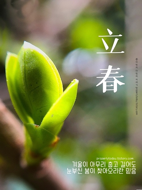 오늘은 봄의 시작을 알리는 입춘입니다. 아직 겨울의 흔적이 남아 있지만, 봄을 맞이할 준비를 천천히 해보면 좋겠습니다. 길어진 햇살과 따뜻한 바람이 마음에 스며들기를 바랍니다. 계절의 변화 속에서 새로운 다짐을 세워 보세요. 건강과 행복이 가득한 한 달 보내시길 바랍니다.