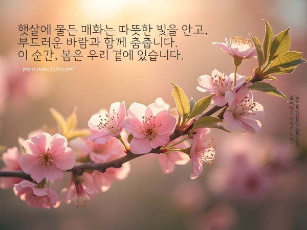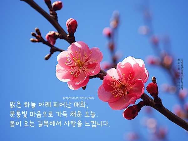 매화는 추위를 이겨내고 피어난 봄의 전령입니다. 꽃잎 하나하나가 희망과 설렘을 담고 있어 보는 것만으로도 마음이 맑아지죠. 매화의 은은한 향기처럼 좋은 일이 가득한 달이 되시길 바랍니다. 겨울과 봄의 경계에서 새로운 시작을 준비해 보세요. 뜻깊고 행복한 2월 보내시길 바랍니다.