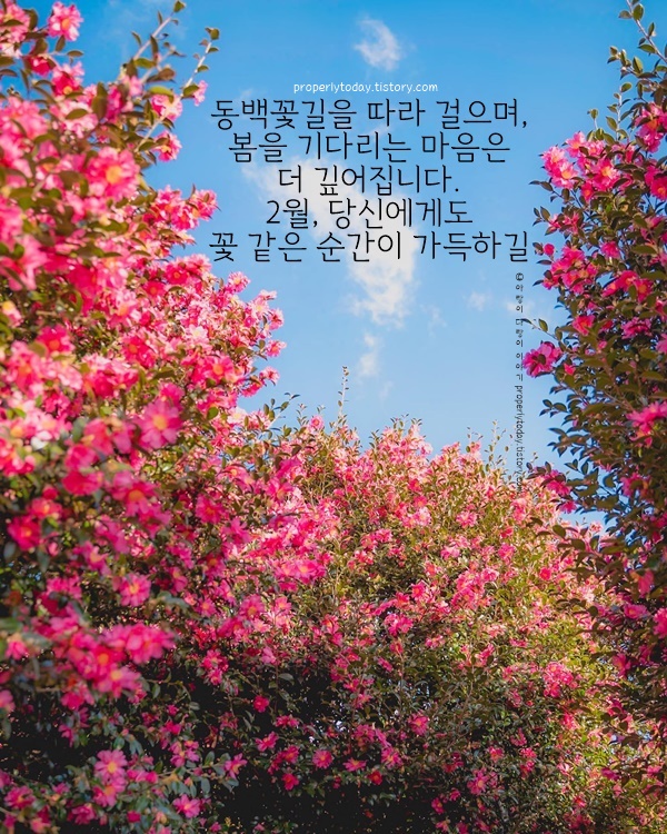 2월은 겨울과 봄이 만나는 순간의 아름다움을 담고 있어, 그 사이에서 우리의 마음도 새로운 시작을 준비하게 되는 것 같습니다. 여러분의 2월도 봄을 기다리는 설렘으로 가득 차길 바라며, 따뜻한 변화가 찾아오는 시간이 되기를 기원합니다.