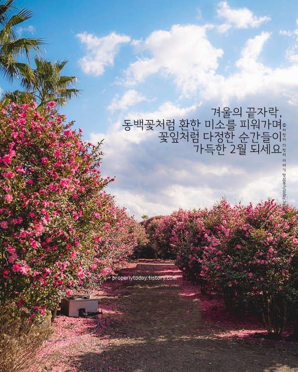 2월 중순, 동백꽃이 서서히 지고 있습니다. 겨울의 끝자락에서 붉은 꽃잎이 떨어지며 봄을 준비하는 모습을 보면, 삶의 변화를 떠올리게 됩니다. OO님도 동백꽃처럼 지나간 시간 속에서 배운 것들을 마음에 담고, 새로운 봄을 맞이할 준비를 하시길 바랍니다. 따뜻한 2월, 건강하고 행복한 하루하루 되시길 기원합니다.