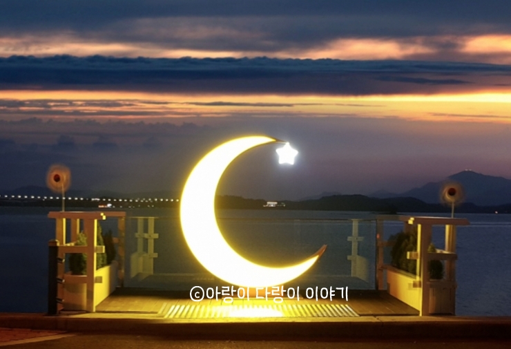 사천 무지개해안도로 - 노을 품은 달도 함께 사천여행코스입니다. 일곱빛깔 무지개색 해안도로는 아름다운 노을 풍광으로 모두의 발걸음을 멈추게 하는 사천 가볼만한곳 베스트 10으로 주변 풍광과 잘 어울리는 초승달 조형물 포토존이 들어서 더욱 주목받고 있습니다.