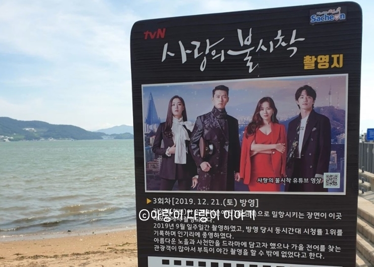 사랑의 불시착 촬영지 사천 대포항은 전어로 유명한 곳이고 아름다운 노을과 사천만이 무척 인상적인 경남 당일여행 갈만한 곳입니다. 사천 대포항은 방파제에 설치된 최병수 작가의 '그리움이 물들면...'이라는 작품이 설치되어 이곳에서 사진을 찍으려는 관광객의 발길이 이어집니다.