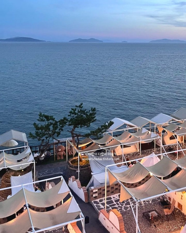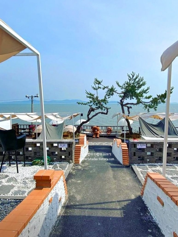 동막해변 앞 대형 베이커리+캠핑카페입니다. 텐트에서 빵도 먹고 라면도 끓여 먹을 수 있으면서 반려견 동반 가능합니다. 텐트사용은 2시간 제한이 있고, 천국의 계단 포토존도 있었습니다.