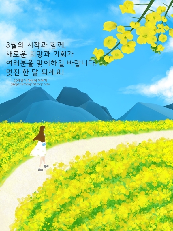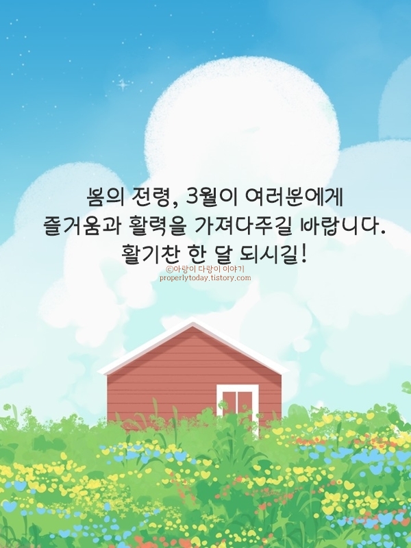 3월의 시작과 함께, 새로운 희망과 기회가 여러분을 맞이하길 바랍니다. 멋진 한 달 되세요!