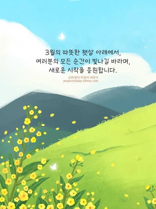 3월의 따뜻한 햇살 아래에서, 여러분의 모든 순간이 빛나길 바라며, 새로운 시작을 응원합니다.