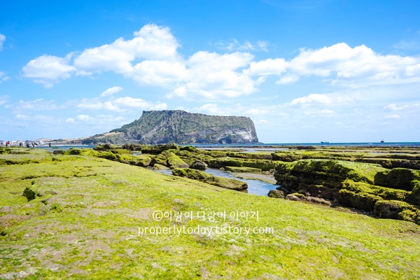 가장 이색적인 제주 해변 광치기 해변입니다. 초록 광치기 해변을 본 적이 없다면 성산을 제대로 본 게 아니다! 할 정도로 간조 광치기 해변은 3월 제주도 가볼만한곳 10곳으로 최고입니다. 일출+간조시간에 방문해야하고, 성산항 물때시간을 검색해서 간조시간 전후 1시간 내 방문을 해야 초록 이끼가 드러난 모습을 볼 수 있습니다.