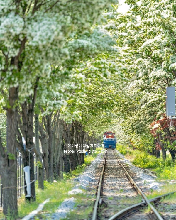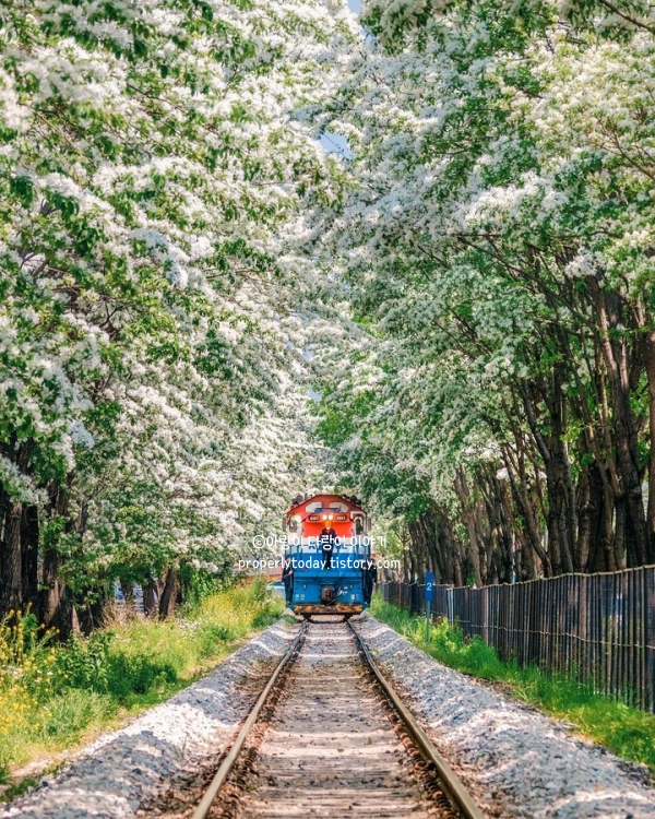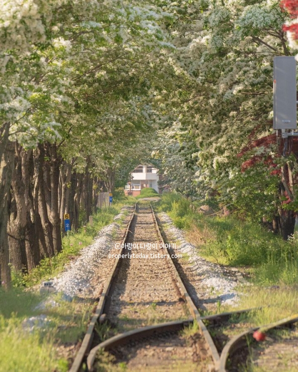 철길 양옆으로 빼곡하게 심어진 이팝나무가 만들어내는 터널을 거닐면 동화 속 한 장면에 들어온 듯한 기분을 느낄 수 있습니다. 그리고 이 아름다운 경치는 마치 일본 애니메이션에서 본 듯한 아련하고 몽환적인 분위기를 자아내죠.