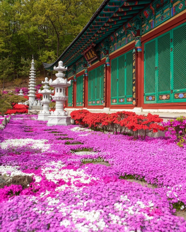 충청도 5월 꽃구경 가볼만한 곳 금강사는 꽃잔디 사찰로 유명한 곳으로, 서울에서 한 시간 반 거리에 위치해 접근성이 좋습니다. 최근 몇 년간 꽃잔디로 잘 알려진 이 사찰은 특히 9시에서 10시 사이에 그림자가 지기 때문에 이후 시간에 방문하는 것이 더욱 아름다운 풍경을 볼 수 있습니다.